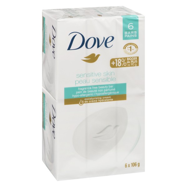 GENTLE ON SENSITIVE SKIN Nourish your skin with Dove Sensitive Skin Beauty Bar. With its fragrance free and hypoallergenic formula it gently cleanses for softer skin than ordinary bar soap.